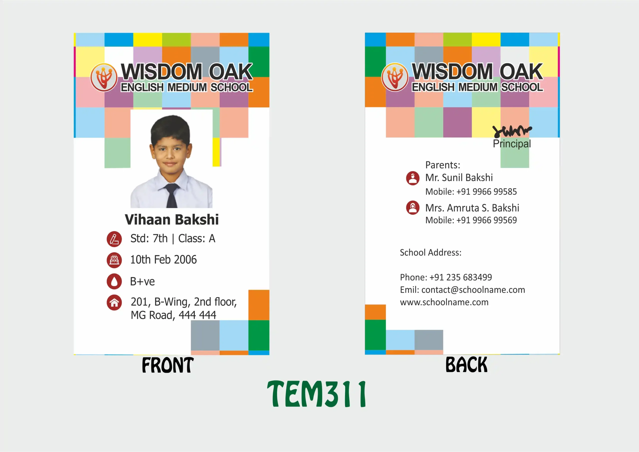 Easy to Edit: Name, Photo, ID No., Class, Designation, Address, Mobile No.